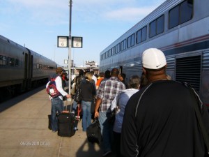 The trip to and from Maryland was my first time on a train. From KC you first take a 7.5 hour ride on the Southwest Chief to Chicago, then you have a layover of about 3 hours, then hop on the Capitol Limited for a ride of about 15.5 hours. That’s the theory anyway. In practice the first leg was fine but the Capitol Limited was late getting to Chicago so we were 2 hours late leaving. Due to various flash flood warnings the train could only go about 25 miles/hour much of the way and we lost another 3.5 hours. Instead of arriving in Maryland with plenty of time to rest and freshen-up before the wedding rehearsal, I got there late. The trip back was on schedule, and features a 6 hour layover in Chicago – which will be the subject of the next post.