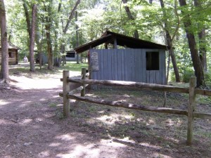 Saturday evening we went for a short hike on Rock Bluff. We found a really cool camping area that would be good for a group – several picnic tables, fire rings, and open-on-one-side huts called Adirondack shelters – in a large clearing. There are even his & her outhouses that looked like they hadn’t been used for awhile. Had good views from here too.