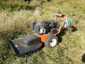 A “DR All-Terrain Mower” borrowed from the Corps of Engineers. The goal was to reclaim part of Section 1 on both sides of 66th Street that had become overgrown during the summer. I made at least two passes over about 2 miles of trail or more than 4 linear miles total. Much of this part of the trail was in open areas and thick with lespedeza – yet another non-native invasive species that seems to thrive everywhere. The guy I was assisting did the tree pruning and re-blazing.