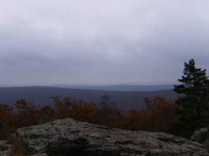 Barely visible here in the center of the horizon is the new upper reservoir of the Taum Sauk pumped storage plant on Proffit Mountain. The old reservoir failed in 2005 and wiped-out part of Johnson’s Shut-Ins: