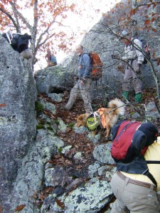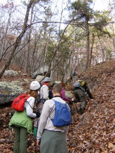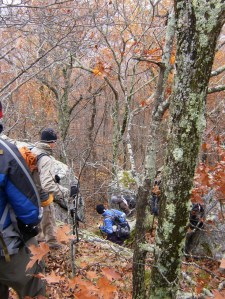 Then we crossed the creek and the real fun began – a climb 500 feet up Lindsey Mountain. Most of this was rocks up to about 2 feet in diameter that were covered with leaves so you never really knew what you were stepping on. Very challenging!