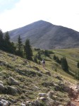 Like all other Colorado trails, it seems, this one starts with a series of switchbacks. These go on and on almost forever, climbing about 2000′ and above tree line before finally leveling-off in “the basin” at about 12,250′. There is a small lake here and also a couple small streams still draining snow melt. I ran out of gas long before I got here and wondered if this was the end of the line for me but after some food and rest felt like I could push on further.