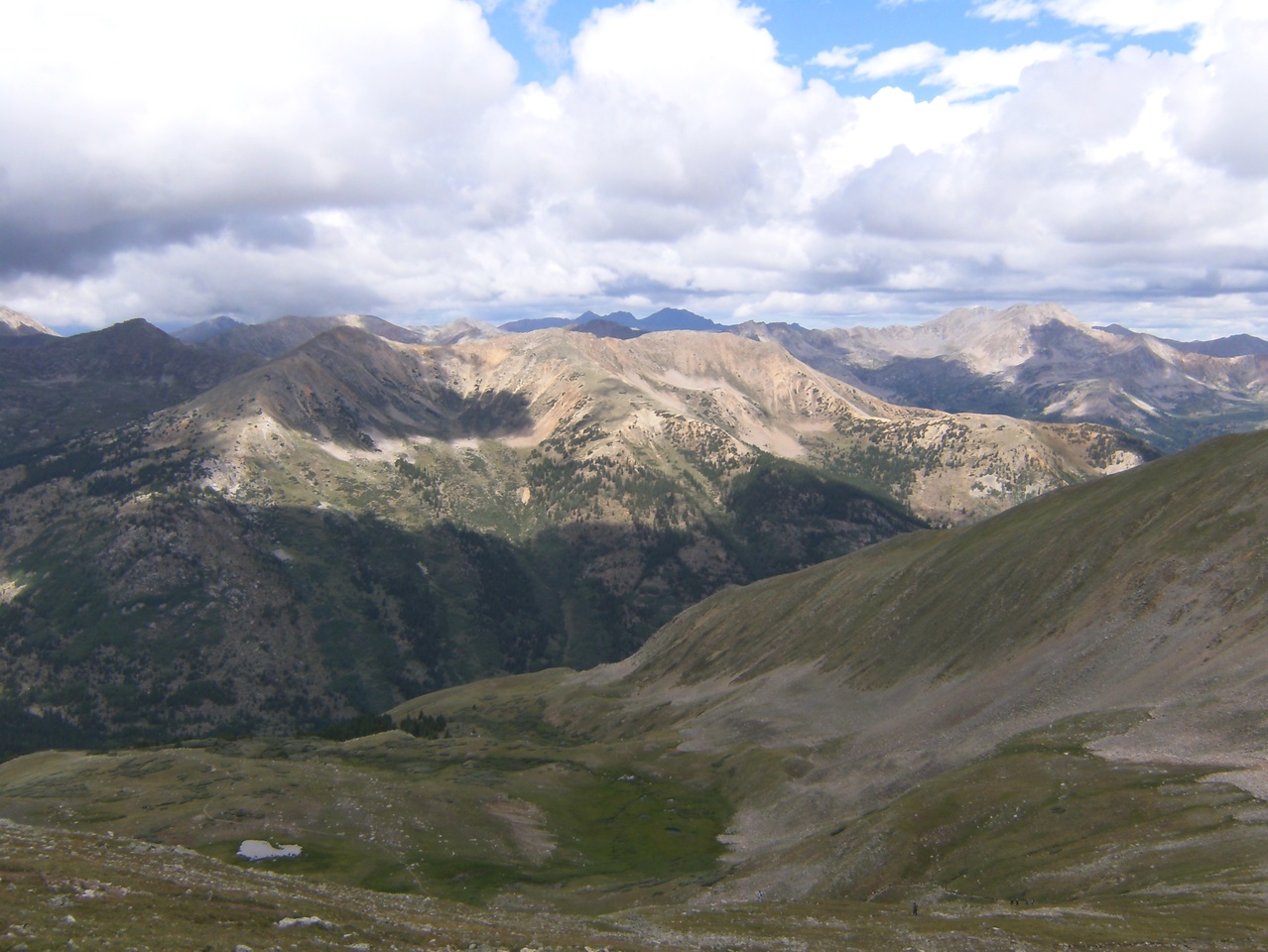 - Looking back at the basin from about 13250′. The lake in the lower left looks pretty small from here.