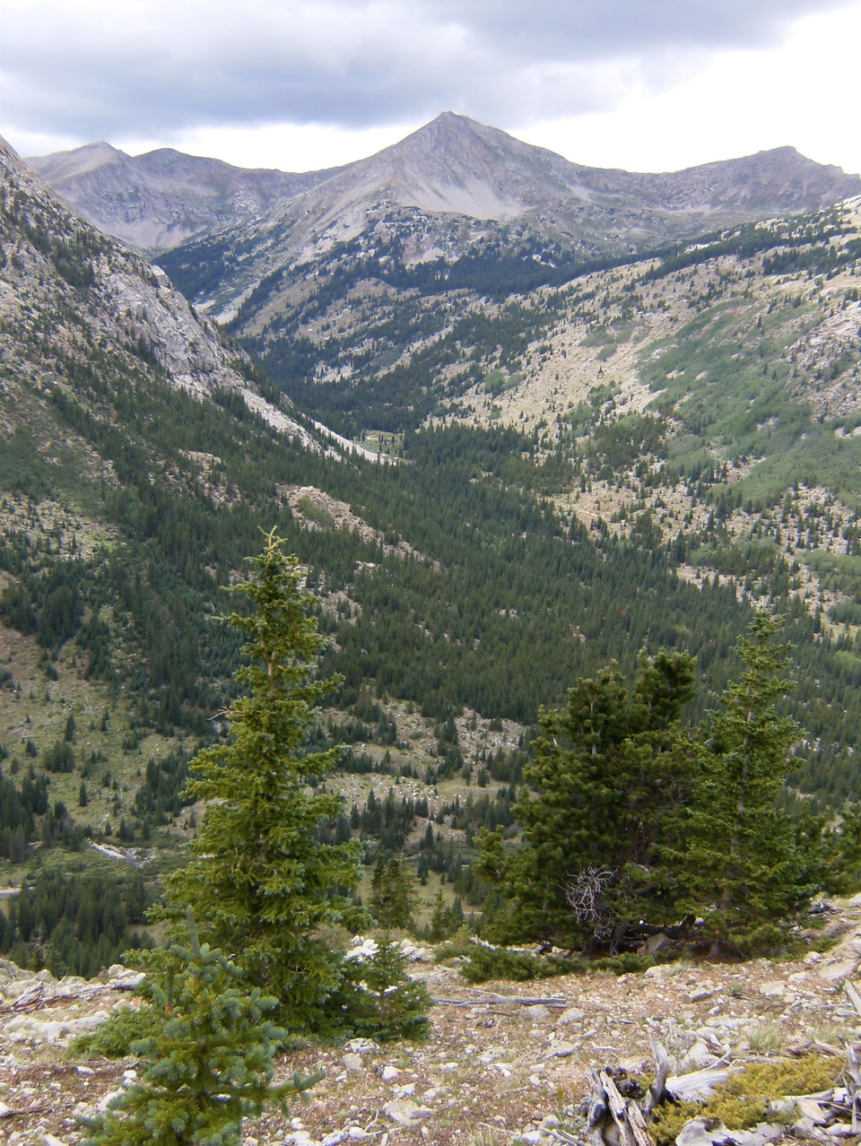 Like all other Colorado trails, it seems, this one starts with a series of switchbacks. These go on and on almost forever, climbing about 2000′ and above tree line before finally leveling-off in “the basin” at about 12,250′. There is a small lake here and also a couple small streams still draining snow melt. I ran out of gas long before I got here and wondered if this was the end of the line for me but after some food and rest felt like I could push on further.