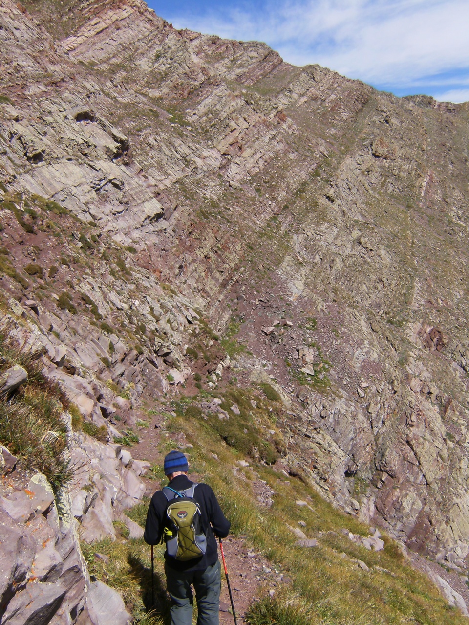 Saturday was the big day. We hiked up to the saddle below Comanche Peak and over onto the trail that runs north along the west face of Spring Mountain to the saddle below Venable Peak, then back over to the east side onto the Phantom Terrace where things got really interesting. There are several places where a misstep means a 1000 foot fall. I wonder if SPOT would survive that? We didn’t go all the way to the Venable trail – we turned back after the Phantom Terrace became less interesting. We debated climbing Venable but decided doing so might leave us vulnerable to the usual afternoon thunderstorm so it was best to go back to Comanche Peak where we would be closer to shelter. The wind on the west side of the range was unbelievable and nearly blew me off my feet a couple times.