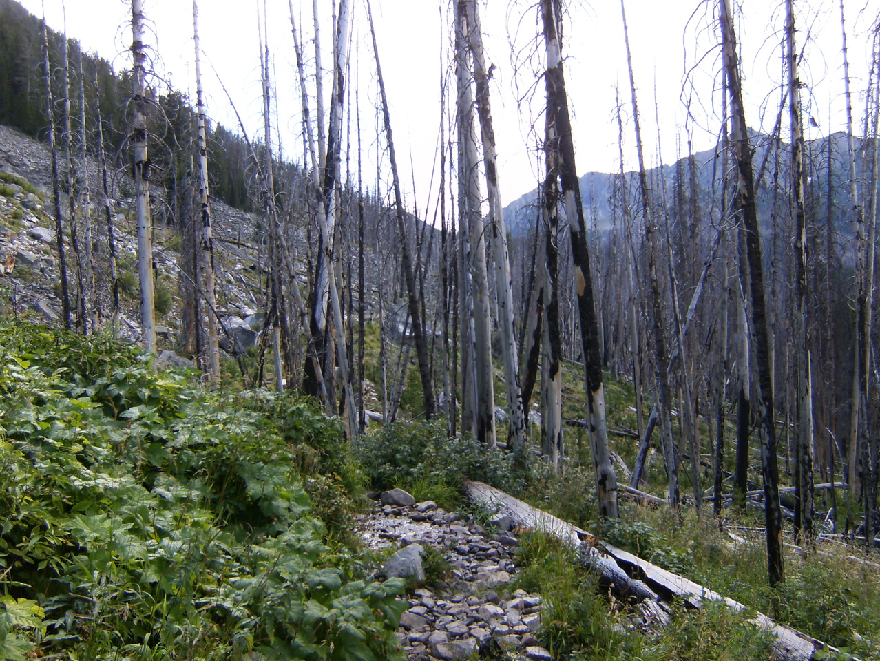 Wildlife was scarce.  One person saw a fox in the meadow before Pintler Pass.  A couple of us saw a weasely-looking thing (Marten or Fisher?) near an ice field above Upper Phyliss Lake.  No mountain goats, no bighorn sheep, no elk, no bear (other than tracks), no big cats.  I don’t remember even seeing deer.  We wondered if the smoke drove them all away.