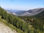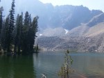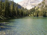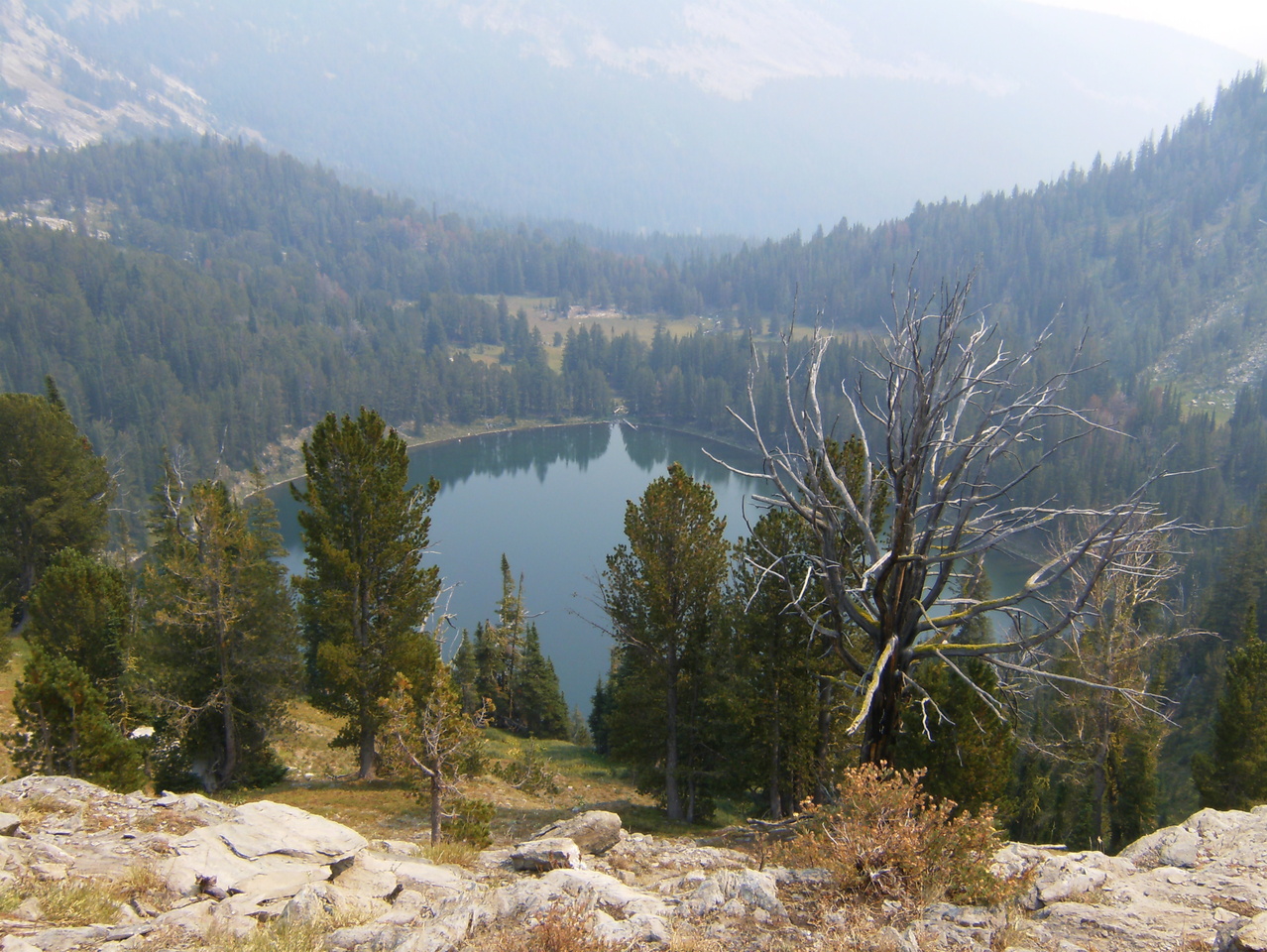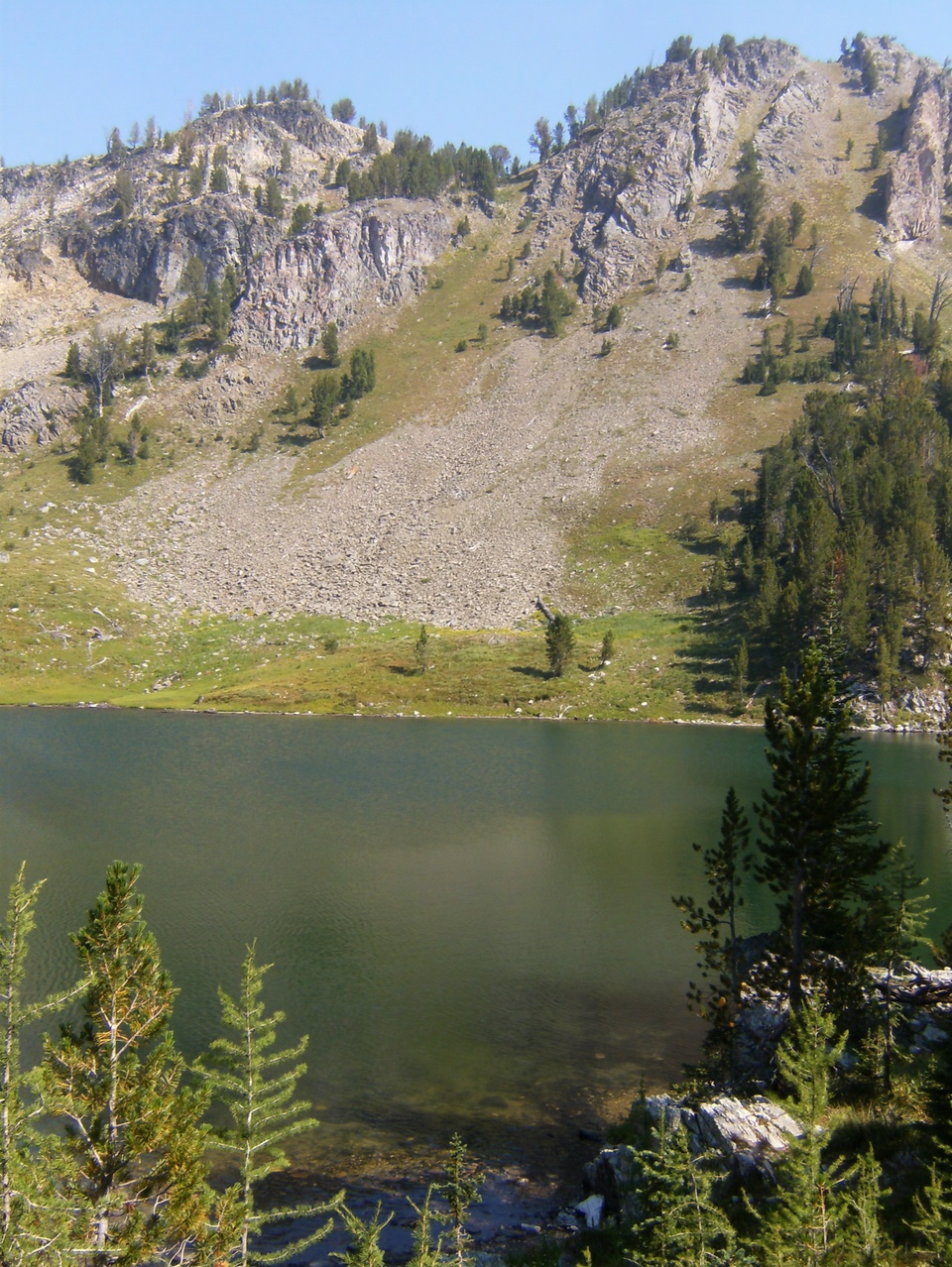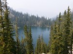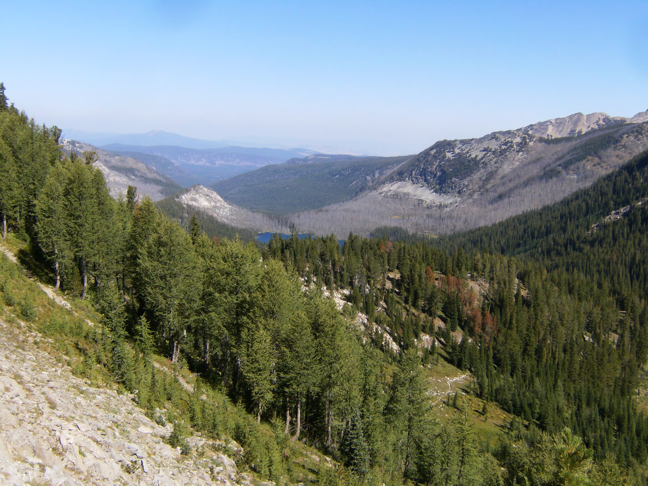 We took a pretty direct route on a trail SW from Oreamnos up to a saddle east of West Pintler Peak, then bushwhacked almost straight south down a very steep slope to the NW corner of S.C. lake. In hindsight, it was too risky.