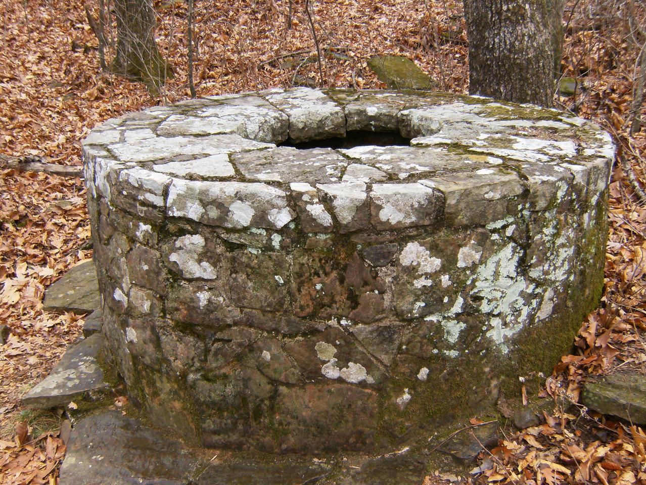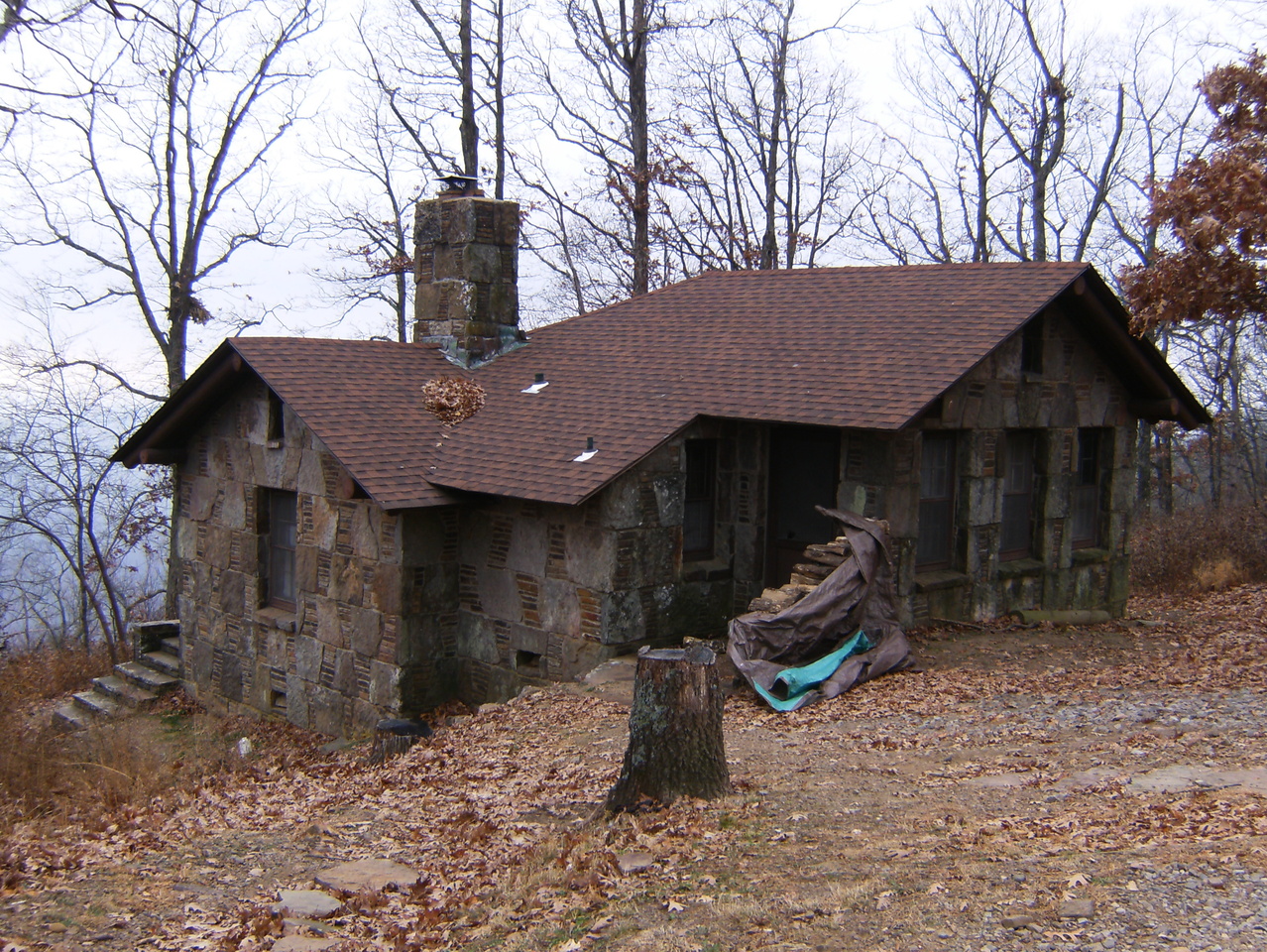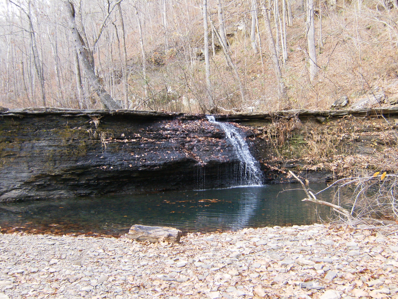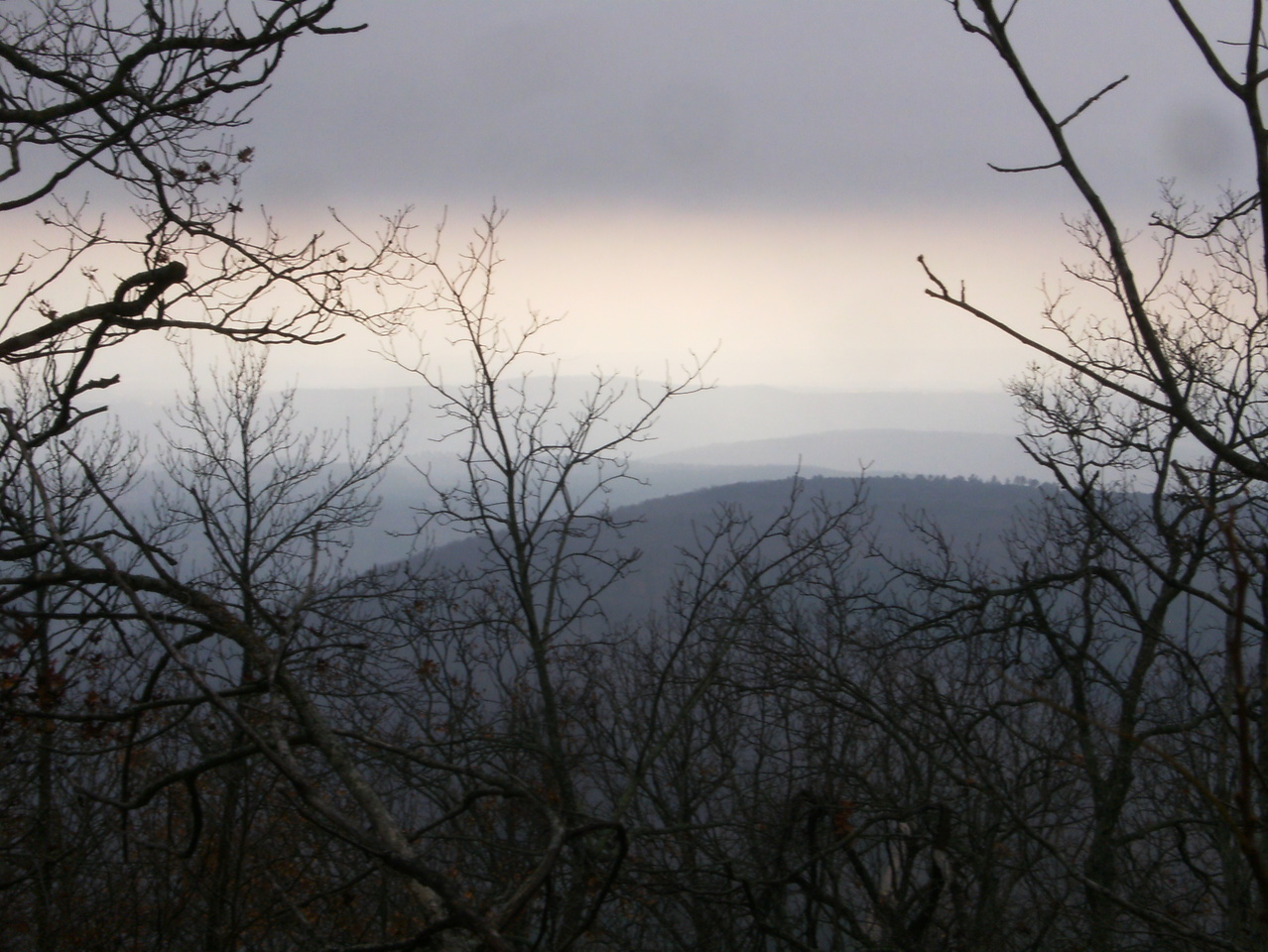 Saturday morning we headed north a short distance along the creek, passing 3 more camp sites, before we started the 1400′ climb.  At the point where the trail tops out there is a spur leading to the mesa atop White Rock Mountain where the 2.2 mile Rim Loop trail rewarded us with some pretty great views, despite the cloud cover.  The CCC did a lot of building here in the ’30s – cabins, campgrounds, picnic areas, shelters, a lodge, etc.  They even built several drinking fountains along the trail, though they no longer function.  This place is probably very crowded during the fall color season.  Continuing east it was all downhill to Salt Fork Creek and then south about 2.5 miles to another established camp site for the night.  Most of the east loop is well above and out-of-sight of the creek but this camp is in a drainage near creek level, though still at least 1/4 mile away.