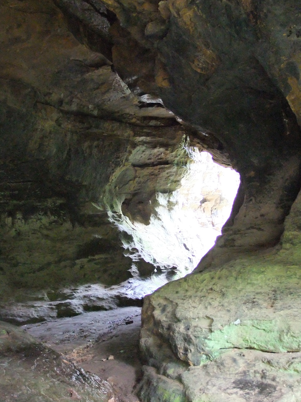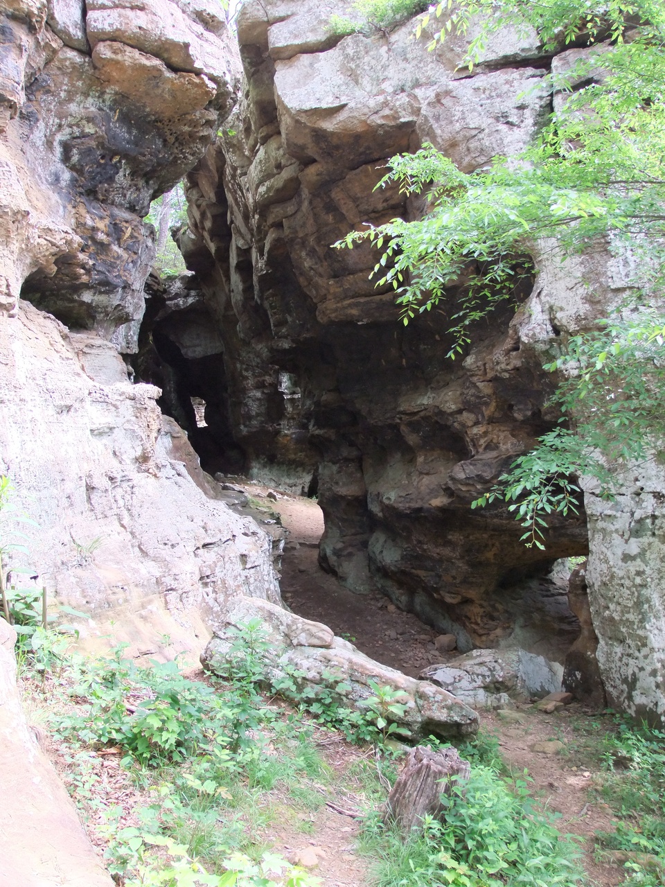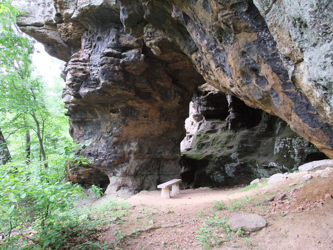 About 20 miles south of Jasper AR, the main feature here is the 130′ natural bridge. There is a short trail down to the top of the bridge with a loop immediately below. There is a large overhang adjacent to the bridge. The two features formed a large cave until the center section of the roof collapsed.