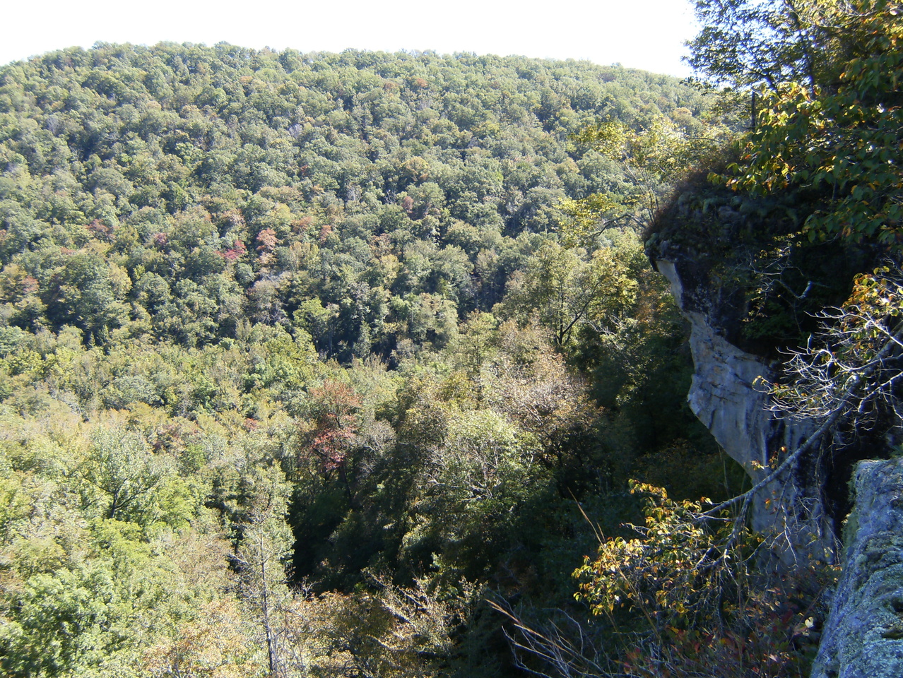 I couldn’t get any useable pictures of Smith Falls from above due to lighting problems, vegetation, lack of good vantage points etc.  Getting below the falls is apparently a pretty arduous trek so we skipped it this time.  As usual, Tim Ernst has some of the best pictures.  I did get a shot of the valley below.  I think the Buffalo River runs from right to left at the base of that mountain.Upper Buffalo Waterfall Hunt.2013-10-06.011It was easier to get below the upper part of McClure Falls, though some members of our expedition chose to take a shortcut.