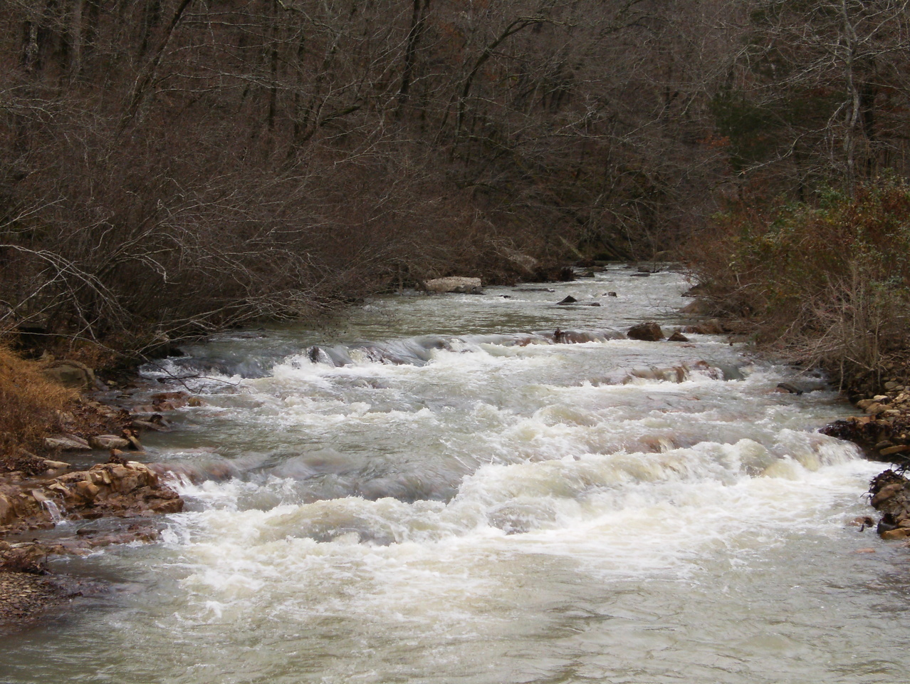 OHT 2.2013-12-22.027At about mile 29.8 the trail turns sharp left off the road bed and begins a gradual descent toward Fane Creek.  At about mile 31.1 it makes another sharp left turn and descends steeply about 200′ to the creek flood plain, turns right, and follows the creek about .25 miles to the crossing.  Fortunately, I didn’t need to cross today, as I think it would have been very risky to say the least.OHT 2.2013-12-22.005Contrast this with the picture I took from the other side 4 days earlier.  Here’s another shot from the Fane Creek Road bridge.OHT 2.2013-12-22.029At one point during the hike, near mile 30 think, I saw numerous fresh pieces of splintered oak tree scattered in the woods.  I think a tree was hit by lightning and basically exploded, scattering pointy debris for maybe 50 yards in all directions.OHT 2.2013-12-22.011There’s something to think about while lying in your tent during a thunderstorm.  🙂