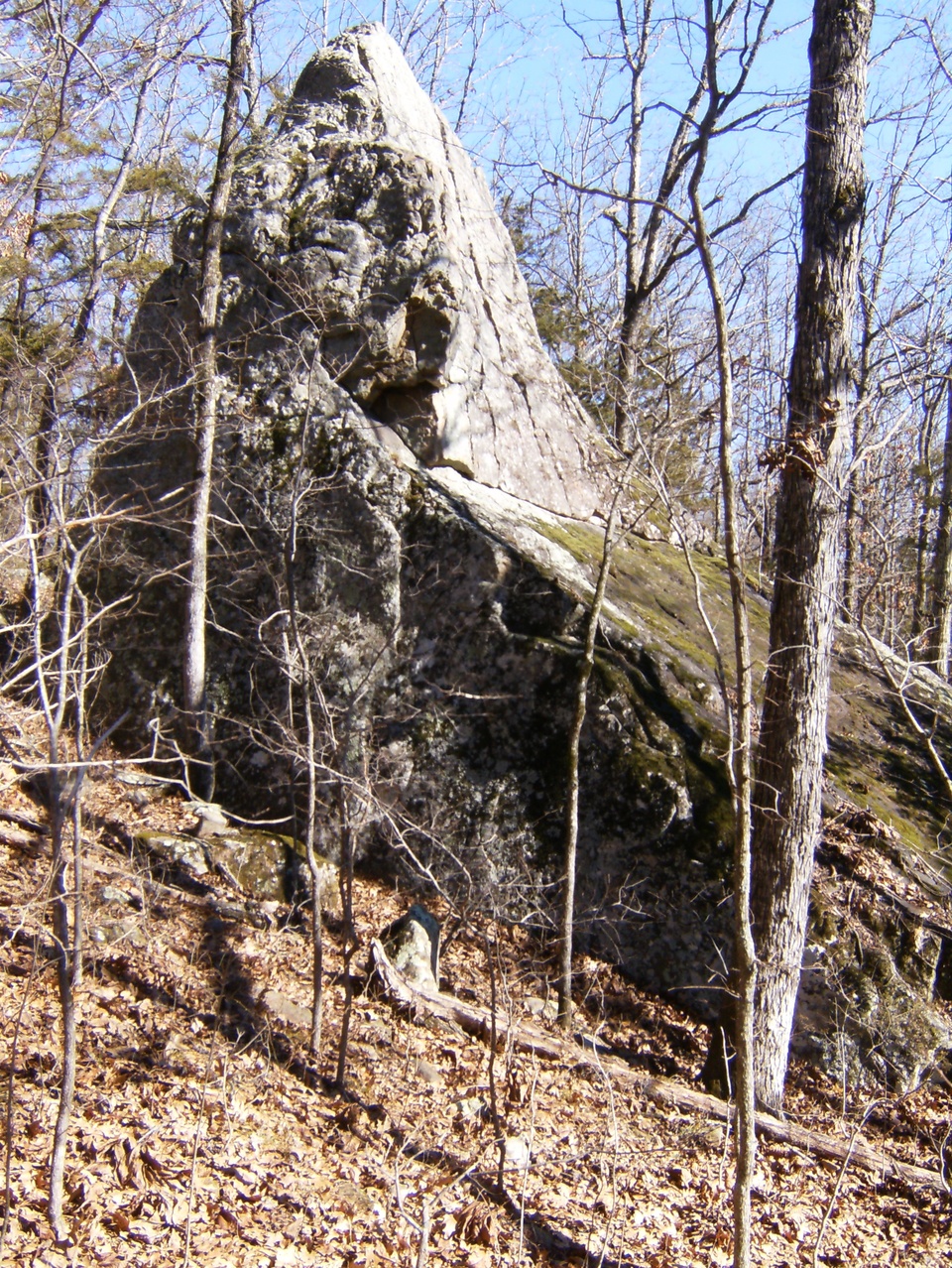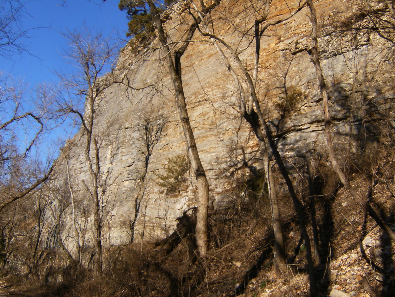 And then there you are. The Narrows, a narrow strand of rock carved on this side by Richland Creek (before the channel shifted) and on the other side by the Buffalo River (similar to The Pinnacles – a formation north of Columbia MO). I’d estimate the general height as 80-100 feet. There are ways to climb on top but that would have to wait until tomorrow – I’m a mile from the finish line and eager for the checkered flag.