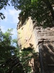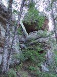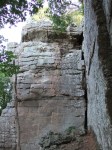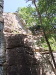 On the west side of AR123 is a several-miles-long sheer bluff line that attracts rock climbers like bears to honey. There is a bit of a peninsula in this bluff and that is the location of the Sam’s Throne Campground (the entrance from AR123 is at 35.879036, -93.04474), which becomes the launching point for many adventures in the area. Sam’s Throne lies a short distance from the tip of this peninsula (and probably used to be part of it). Here’s a picture of Sam’s Throne from the tip of that peninsula:
