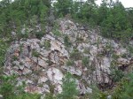 Back down from the overlook, the trail continues north to another overlook area above the lake’s dam across a narrow and deep gorge. The pronounced tilt of the bedding planes here shows one of the big differences between the Ouachitas and Ozarks.