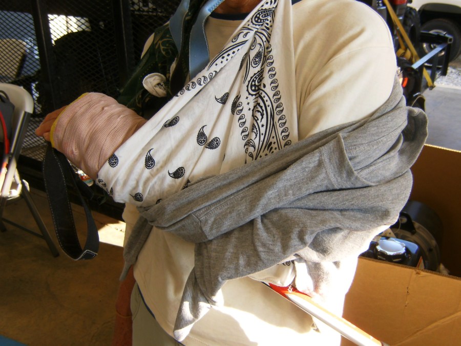 A damaged arm splinted with a hiking pole, padded with a Thermarest Z-Seat, wrapped with an ACE bandage, slung with a couple bandanas, and swaddled with a long-sleeved t-shirt.