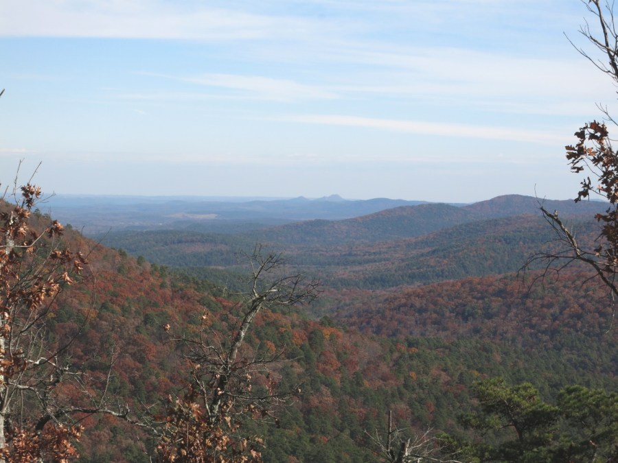 Looking east from Flatside Pinnacle. Pinnacle Mountain is the bigger of the peaks on the horizon and is near the eastern end of the trail – about 53 trail miles away.