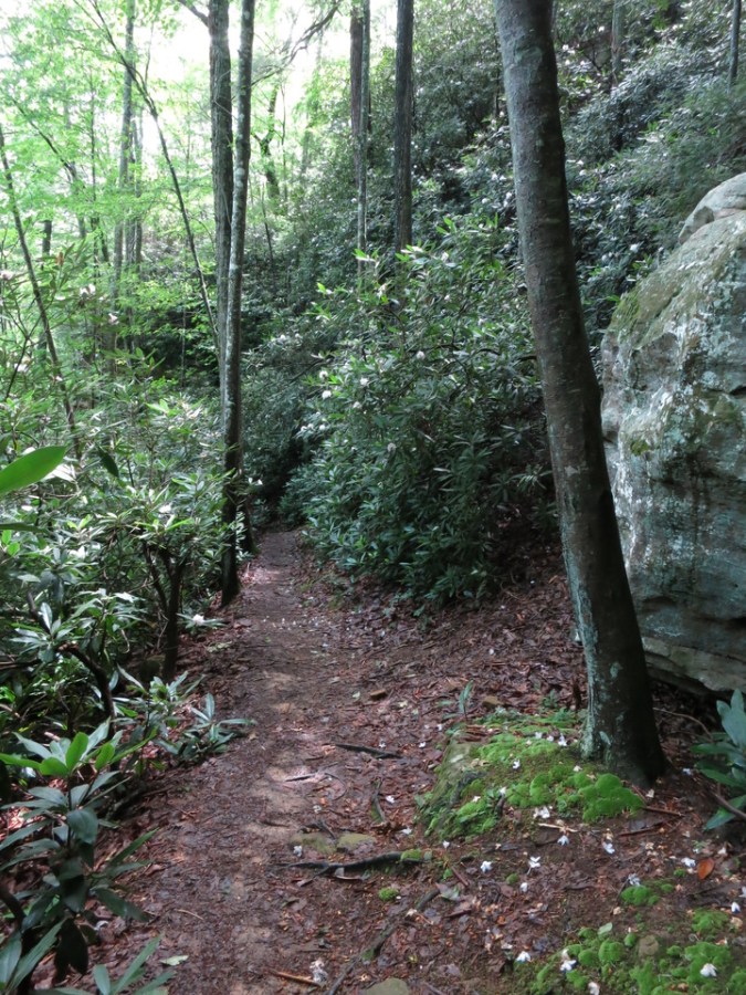 The trail disappears into a tunnel of rhododendron