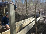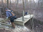 The Ozark Highlands Trail Association built a 20′ bridge across a gulley for the Middle Buffalo River Trail near the Grinders Ferry trail head. On Nov 14 a small group set the footings and today a larger group – 6 of us – got much of the lumber moved, cut, and assembled. We will need one more trip to finish the hand rails, build steps at each end, trim the deck boards, and tighten some screws, but it’s usable as is and will help prevent further erosion from hikers going through the gulley.