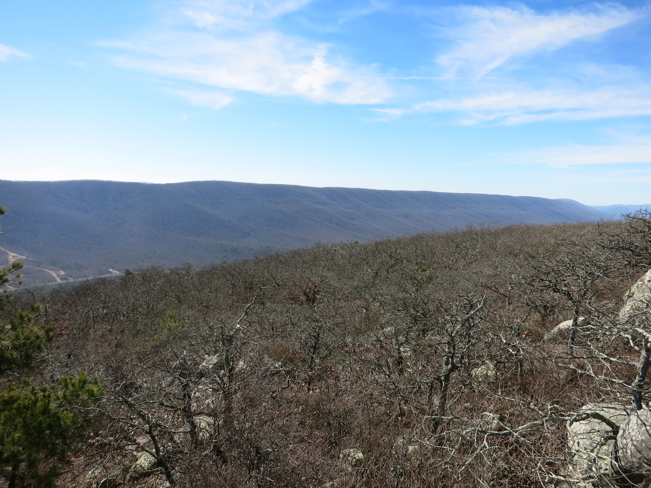 On the way back I bushwhacked about a mile along the north side of the ridge to skip that part of the trail that drops 400′ to go around the rock slide and then back up 400′. At the peak of the ridge there is a lot of dense brush and briars but just below is mostly rather grassy and open with the stunted and gnarly oaks characteristic of that area and altitude. I wanted to get a picture from the top of the rock slide and figured I could peek over the ridge once in a while until I got there but I guess I waited too long for the first peek and missed it.