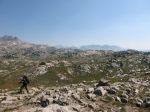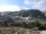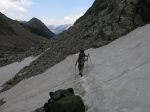 Day 4: Trail Creek Park to Peak Lake. While eating breakfast we hear an elk bugle nearby. We start the day by climbing from about 9600′ on a no-longer-maintained trail through Vista Pass at about 10200′, then down into the next valley to about 9800′ before climbing again toward Cube Rock Pass at 10740′. We scramble for 1/4-mile over the remnants of a landslide – the first time any of us have done this with a full pack – followed by traversals of a couple snowfields that, while not difficult, did certainly focus the mind on not making a long slide to the bottom. We all agree that this is some of the toughest hiking any of us have done. Once through the pass, we descend to a campsite at about 10600′ overlooking Peak Lake. We set up camp in a hurry, thinking we are going to get dumped-on but the rain holds off. We watch a group of three descend from Shannon Pass (where we will ascend tomorrow). They camp elsewhere along the lake. Near dusk another hiker on a 14-day trip shows up.