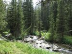Day 3: Lozier Lakes to Trail Creek Park. We begin the day with a descent past Lower Lozier Lake, a climb to Clark Lake Pass, then a long descent to Clark Lake at 10250′ where we stop for lunch. We meet a man from Lawrence KS near Lower Lozier Lake. After lunch, it’s more downhill until we cross Trail Creek (which becomes the Green River further downstream) at about 9300′. We see 2 more people. We turn south on the Continental Divide Trail and begin climbing again, looking for a camp site and finally finding one just past the junction with the trail going to Vista Pass.