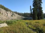 Day 6: Summit Lake to Rainbow Lake. 2 people hike past Summit Lake in the morning, heading north on the CDT. We’re getting some smoke from Idaho wild fires and my eyes and sinuses burn. We’re expecting this day to be small elevation changes but the ups-and-downs are bigger than expected as we pass No Name, Cutthroat, and Palmer Lakes. Add in a lot of sun exposure and this turns out be a pretty tough day. We end at Rainbow Lake @ 10190′. A lone man shows up around dinner time and skinny-dips in the lake.