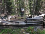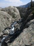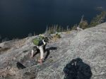 Day 6: Our destination is the camp sites a little north of the Ross Lake outlet. It’s about 1 mile so we think this will be a pretty easy day. We follow a path along the lake to a huge granite outcropping just before the outlet. It looks like there’s a way to get around it but it’s very risky, with a mistake sending one sliding down into the lake. We spot some cairns marking a way up and over that looks better. The outlet of Ross Lake is impressive. I can see the water cascading away through a deep channel and then disappear over what must be a heck of a waterfall. We cross on a pile of logs. There’s another big granite outcrop on this side of the outlet, with a good path leading around behind it. We’re not impressed with the camp sites we find in the area and decide to head to the north end after lunch. There’s a level-looking area on the map that seems promising while also shortening the next day’s hike out.
