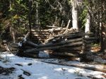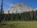 Day 2: We awake to a temperature of 30 and a mix of sleet and freezing rain with a few snowflakes thrown in. It warms a bit and we have rain off and on the rest of the day. We quickly get to the burn area and the trail disappears. There are lots of trees on the ground, hidden by wet knee-high grass. We cross a swampy area and then to the west side of East Torrey Creek. The walking isn’t much easier over here – still lots of deadfall and wet areas. Very slow going. We encounter a medium-size (probably black) bear near the creek. It’s 50 feet away and headed almost straight at us but apparently doesn’t see us until we yell. It turns and runs away. We encounter our first big boulder field. We can’t get around it along the creek so we climb up to go around the top and stay high for awhile. There’s a granite wall ahead and it becomes clear we have to descend. After getting back down by the creek we run across the old trail. We turn west as the basin narrows considerably and begin climbing toward Bomber Lake. It begins snowing a bit before we wade across the outlet, which is one of the diciest crossings we’ve ever done. We find a good camp site on the southeast side amongst the trees. We are all exhausted after going only 4 miles. Heavy wet snow continues until about 8PM. No pictures – the camera was in the pack all day due to the weather.