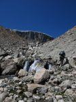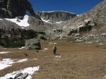 Day 4: We stay at Mile Long Lake. We hike to the upper end of the lake and ascend West Torrey Creek. The Continental Glacier is at the top but we stop short at a snow field at 10800′. On the way back down we see a moose at the upper end of the lake and end up “chasing” him down the trail. RC got out his brand-new Tenkara rod and got his fly wet. When I go to bed I discover my air mattress has a leak.