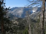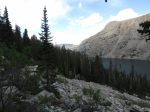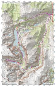 Day 3: We follow a path along the south side of Bomber Lake toward the inlet and then ascend along the creek up into the woods. At a small pond below Turquoise Lake we lose the path and set off cross-country to the saddle below Spider Peak and cross into the adjacent basin. We descend to Lake 10359 (so-named for its elevation), cross the outlet, and head for Mile Long Lake, where we camp on the north side near the outlet. Most of the day was off-trail. Much route-finding and boulder-hopping but the weather was great.