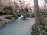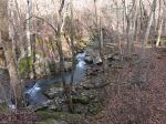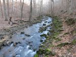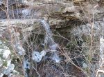 On day #2, we hiked downstream about .25 miles on the old road to the Boen Gulf Branch, then turned up it and bushwhacked about 1 mile to Paradise Falls. About .1 miles below the falls, the going got pretty challenging but we found a way through. After lunch below the falls we found a way up out of the ravine – which was also pretty dicey because of ice and mud – and walked upstream a bit to find some smaller falls and nice scenery in general. Then we headed south across a broad level area where one or more farms had almost certainly once been, and back down to camp. Total mileage for the day was less than 4 but it felt like more.