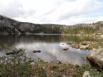 Day 2: We crossed the creek and continued south along Arrow Mountain. We didn’t get far before getting hit with high winds, rain, and graupel. It quit before we got to Glacier Trail Pass (10895′) but we heard stories from people headed north about getting a lot of snow the previous day and we could see it on the mountains ahead as we got to the pass. From the pass, we descended a bit to cross Burro Flat, which was rather wet, often with several inches of water standing on the trail. Nobody escaped with dry socks. We then descended through an old burned area, catching a glimpse of Upper Phillips Lake. Just after crossing the outlet of Phillips Lake we followed a well-worn social trail to Upper Phillips Lake (10230′) and set-up camp at the south end. We were all glad that the most serious threats of rain were behind us. We had a fire ring in our camp site and RC, against all odds, managed to get a fire going though it didn’t last long due to the damp materials on hand.