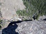 Day 3: We bushwhacked up a boulder-strewn gully to Golden Lake (10560′). Our original plan was that on day 4 we would bushwhack north from Golden Lake out to Goat Flat then WSW across Goat Flat to descend NW through a gully to Bomber Lake – a route described by Nancy Pallister. CC, CE, and I climbed the ridge north of Golden Lake to get a preview of that route. The 1 mile over to Goat Flat looked pretty challenging and when combined with the unknowns of the descent to Bomber Lake we decided we weren’t going that way.
