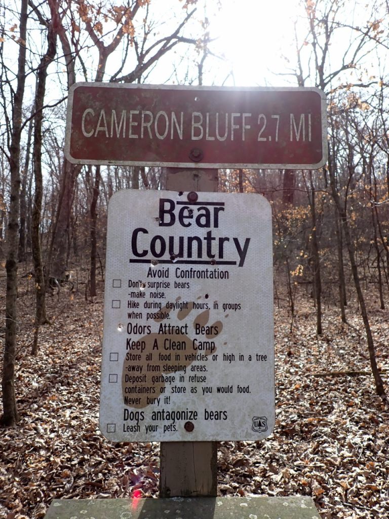 The upper section immediately starts climbing 1100′ to the Cameron Bluff Campground. The actual peak of Mt Magazine – another 210′ up at 2753′ – would be 0.7 miles across the campground and up the Signal Hill Trail. There aren’t any breathtaking views along this section though you can see quite a distance through the trees in leaf-off. Once on top you can walk a bit west to a picnic area with the great views.