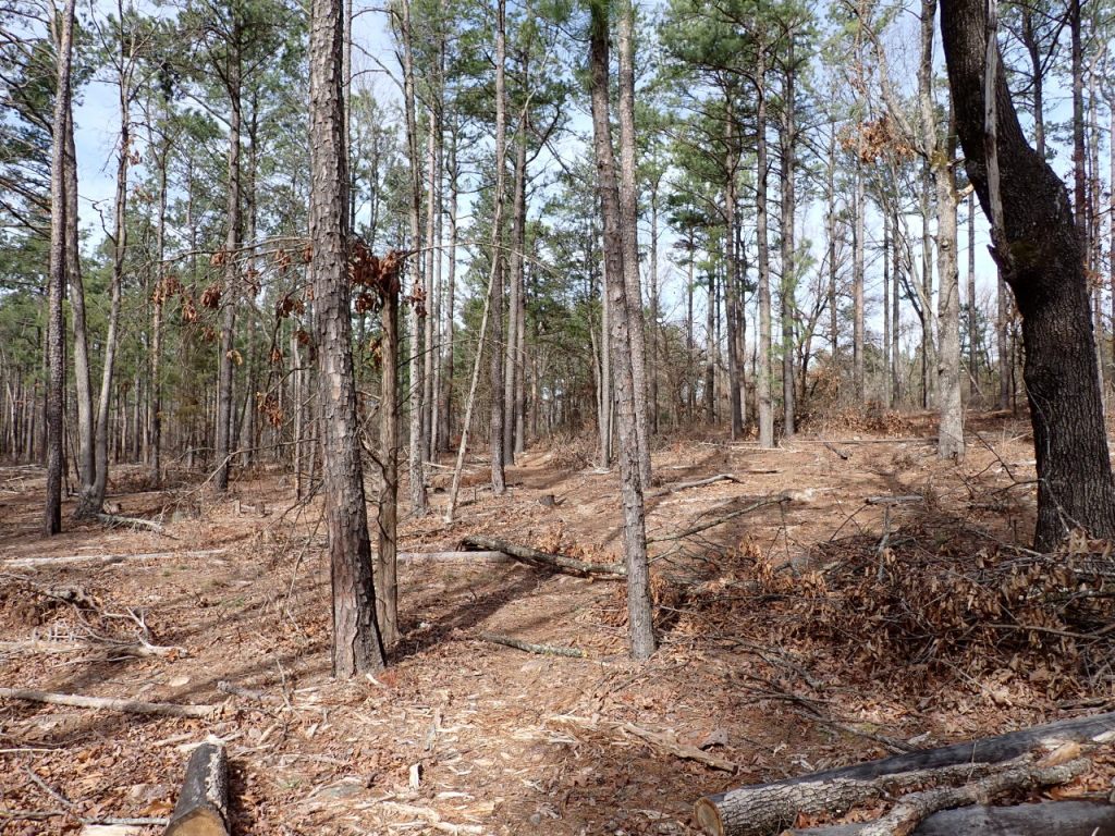 The middle section descends to cross Gutter Rock Creek then climbs back up to the Greenbench Rd trail head. The creek area is a place where I could probably spend several days exploring the tributaries and their bluff lines. I suspect there are some great photographs to be had here in the spring. Much of the last mile is in a recently-logged area that is bound to be a maintenance headache for many years. Near the trail head the trail goes over the dam between two wildlife ponds where the frogs were very vocal.