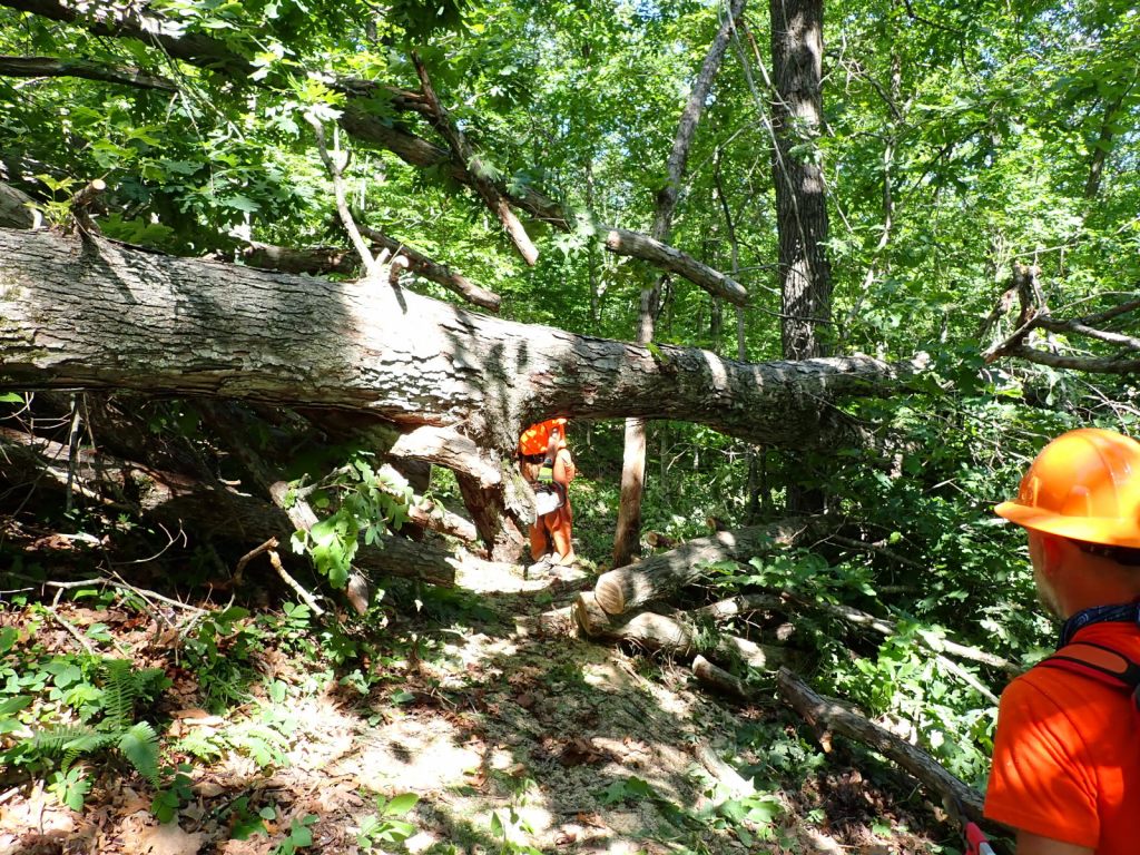 On days 1 & 2, 2 groups attacked from either side the core 1/2-mile of destruction – described by many as a “wall of trees” – finally meeting in the middle. My group spent day 1 working the fringe area east of the core, clearing about 1.4 miles to Blanchard Springs. On day 2 we flipped to the western fringe and began working upstream, clearing only 450′ of trail. On day 3, everyone attacked the western fringe and cleared the remaining 3/8-mile.