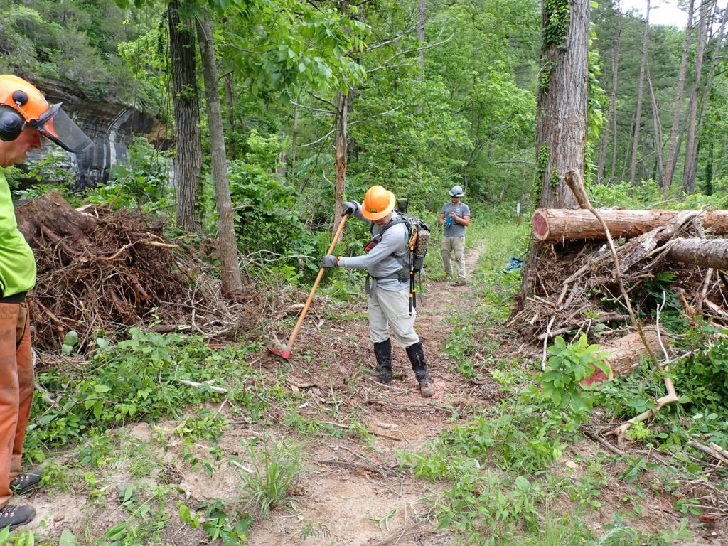 The North Sylamore Creek Trail between Gunner Pool and Blanchard Springs was seriously obstructed by a March 14 tornado and the Blanchard Springs to Allison segment was obstructed by flood debris that accompanied that storm. Thanks to the efforts of a group of volunteers from the Ozark Highlands Trails Association, some of the obstruction is gone.