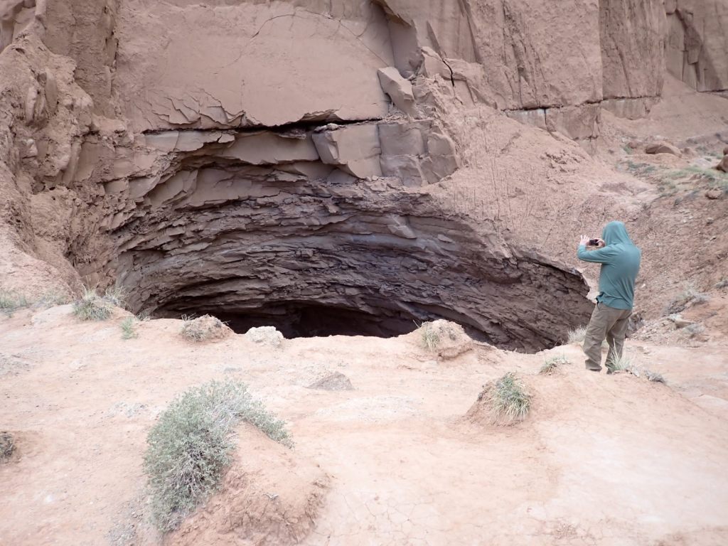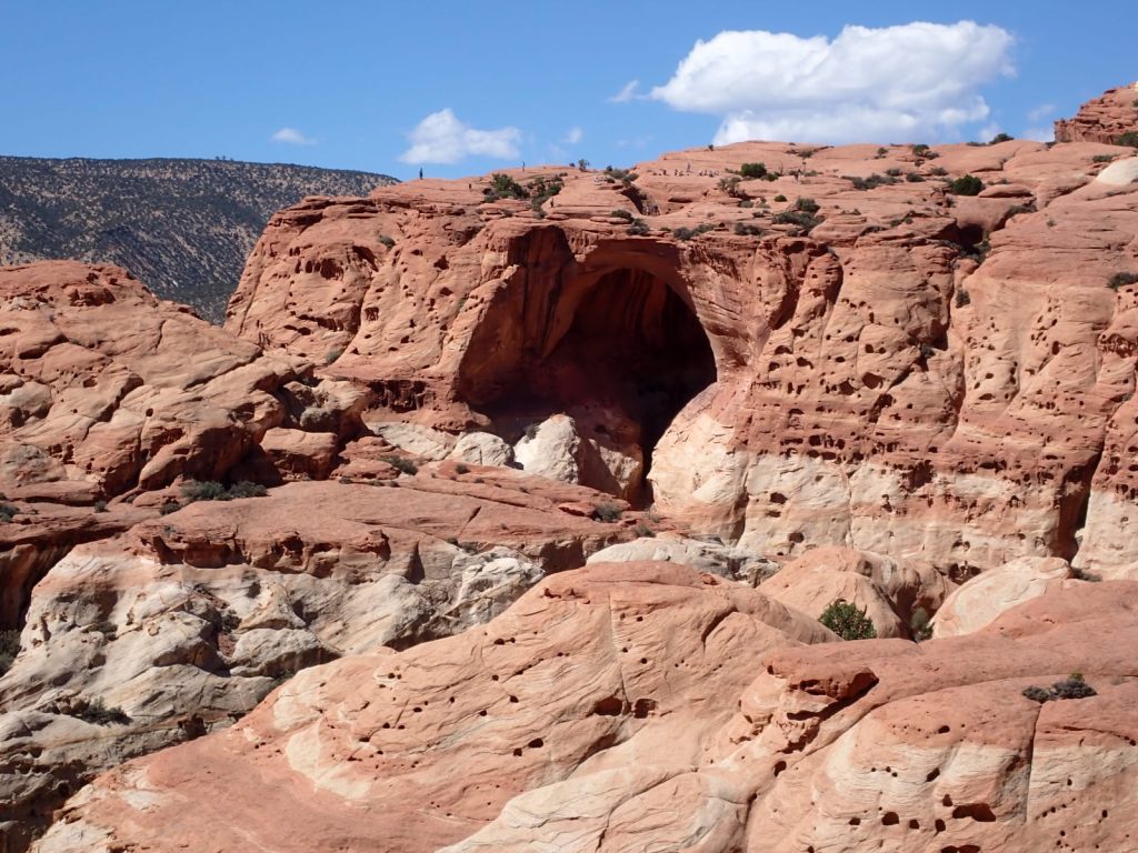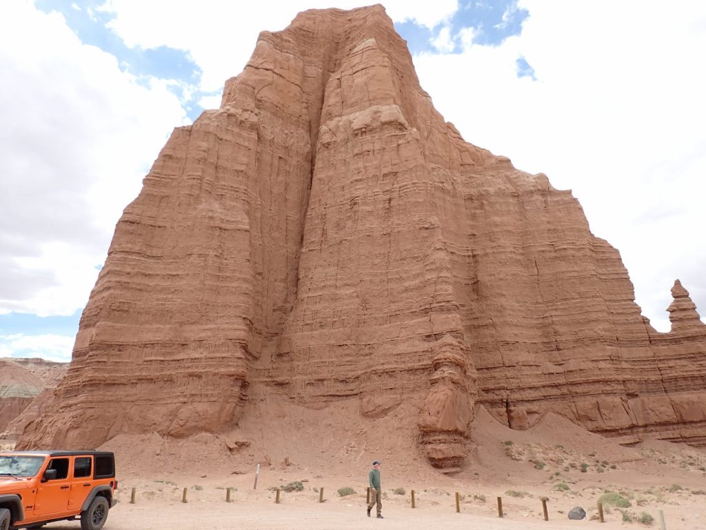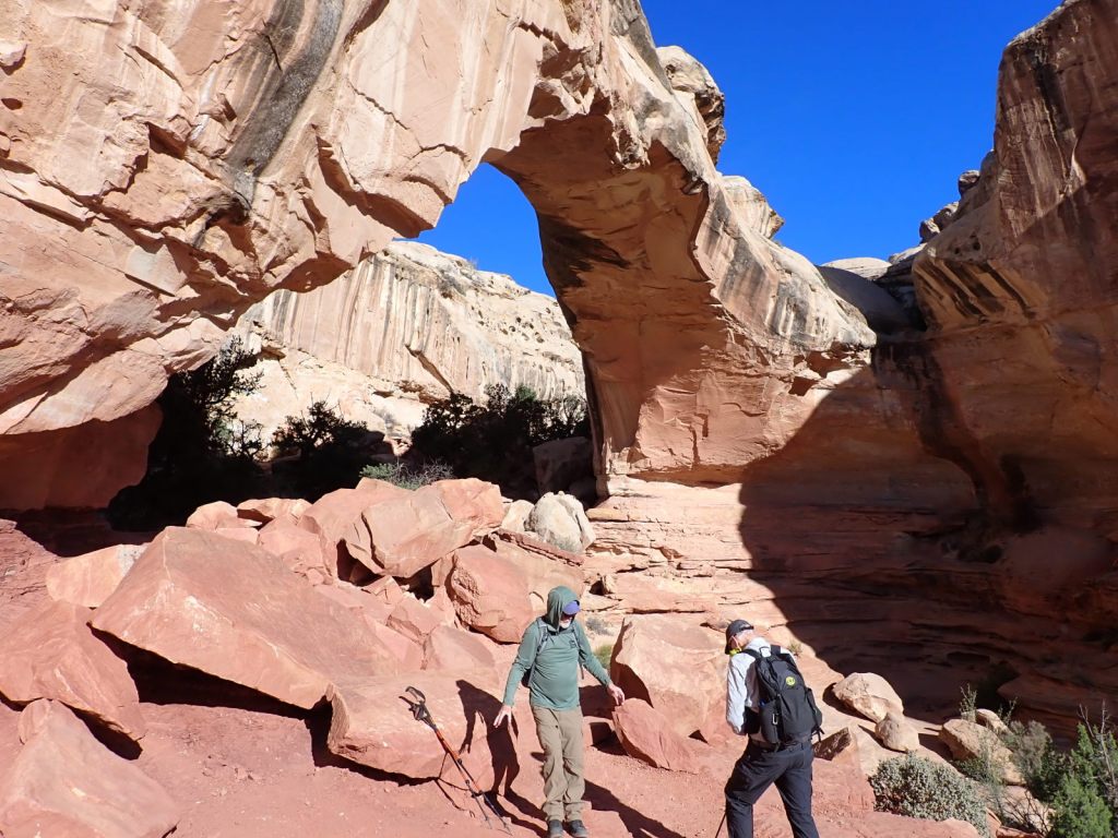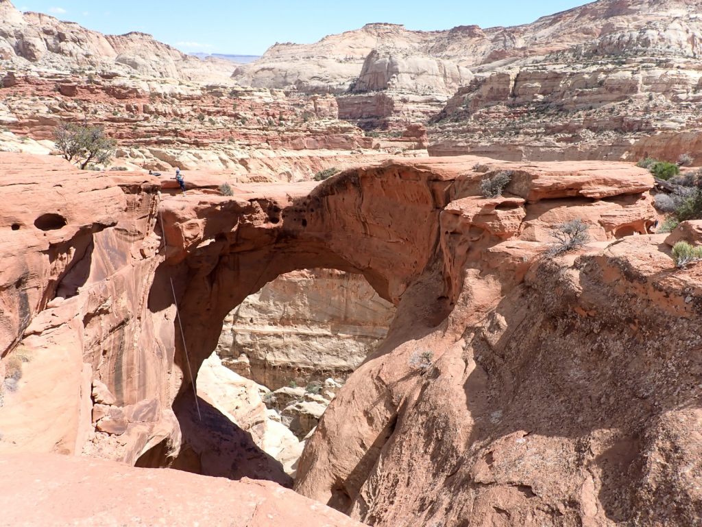 Cassidy Arch is reached from the Grand Wash Trail and requires a climb of 700-950′ (sources disagree but it felt like the bigger number to this unacclimated low-lander). This one differs from most of the arch views in that you hike to the level of the top and look down through it. You get your first view about 1 mile in but seeing it close-up is way better, and it’s only a 3.5 mile round trip. We watched people rapelling from it.