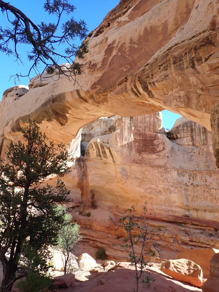 The Hickman Bridge Trail is about 2 miles out-and-back with 400′ elevation gain. It goes under the arch and loops around a ridge.