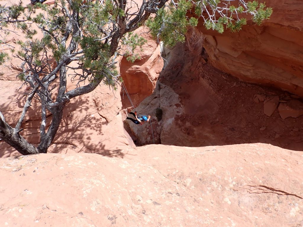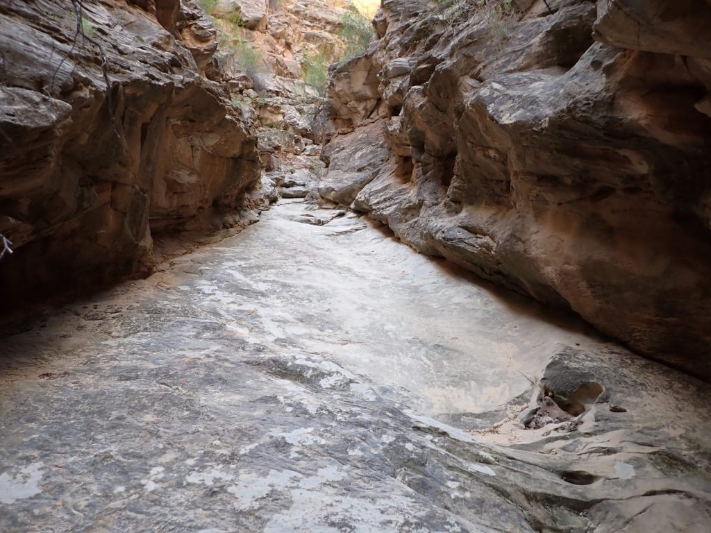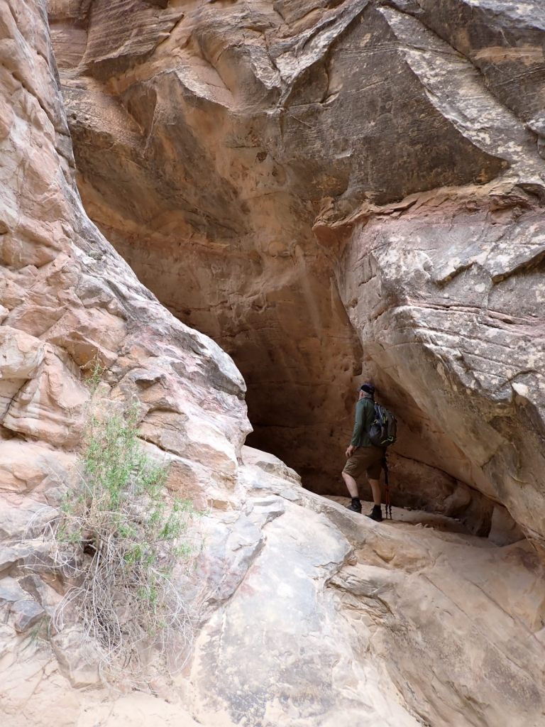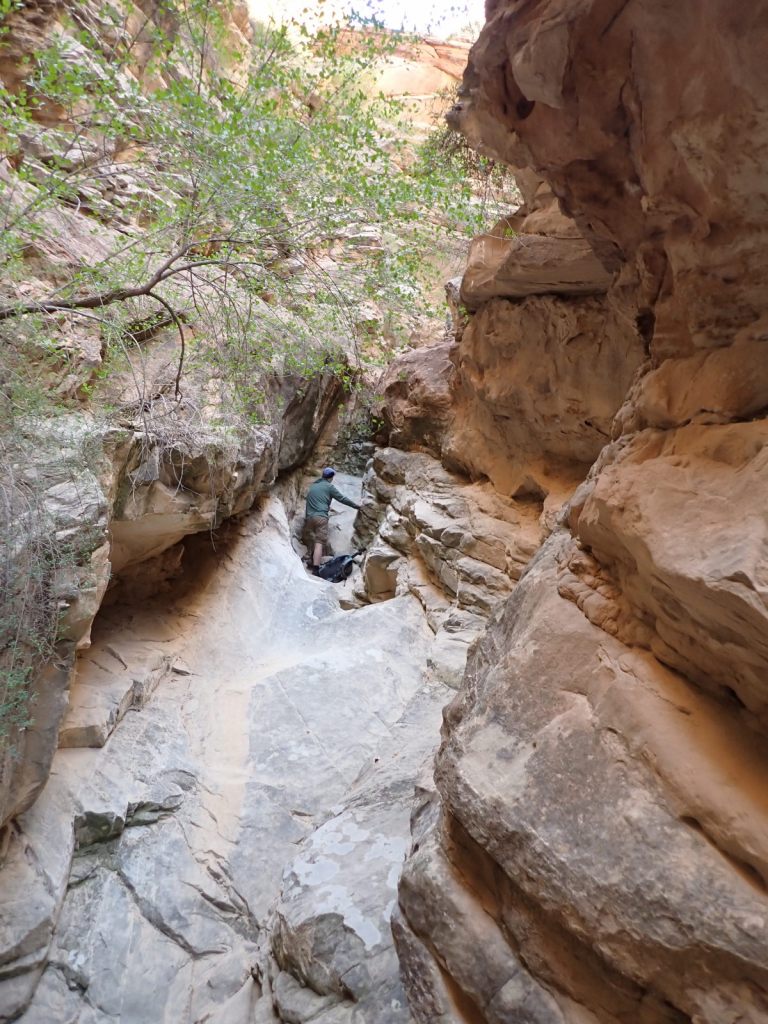 Headquarters Canyon was more interesting and satisfying, with some scrambling required and a variety of environments. We got farther into it as well, eventually coming to a long slick rock ramp with a 15′ wall at the end. People with more skill undoubtedly scale that and continue up the canyon but we were okay with turning around there. I felt like I finally had some slot canyon experience, even if a bit superficial.
