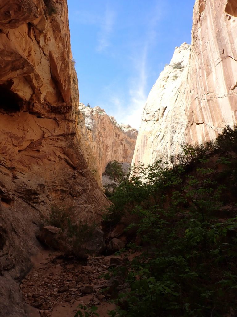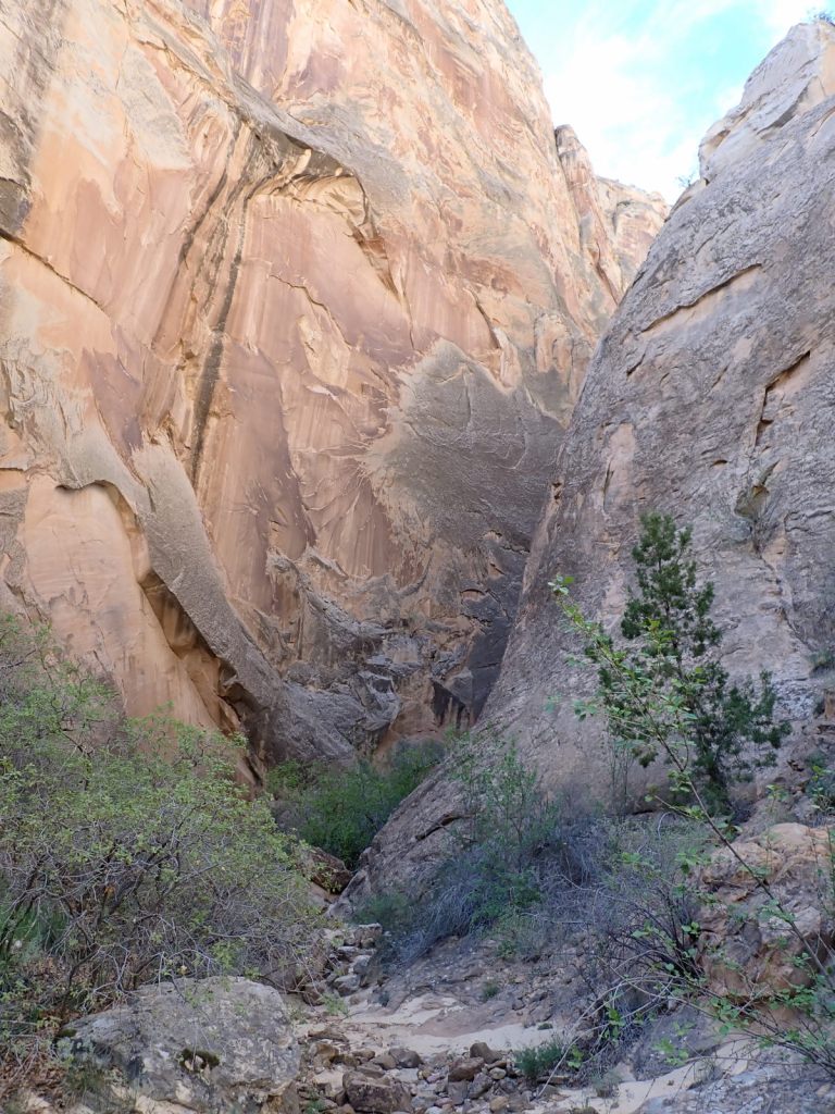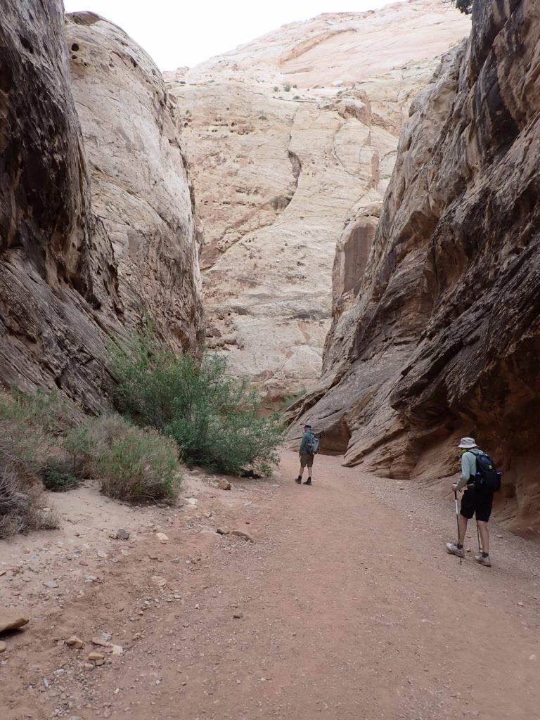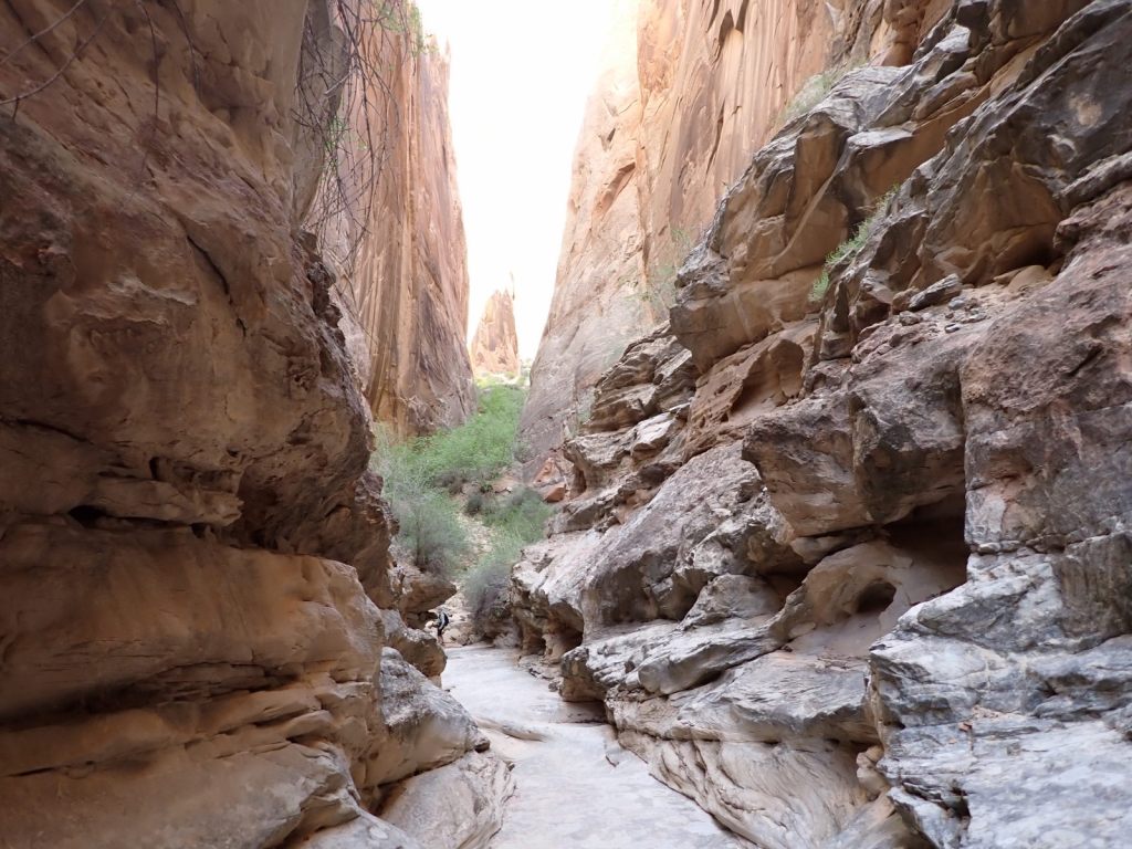 Afterward, we continued east on the Grand Wash Trail about another mile where it narrows as it cuts through the Waterpocket Fold. It’s said to be about 16′ wide and 600′ deep here. It’s an easy walk with little elevation change and very popular.