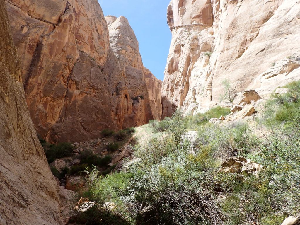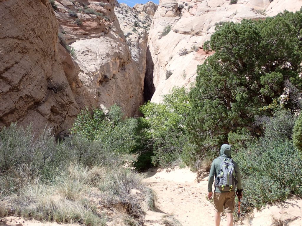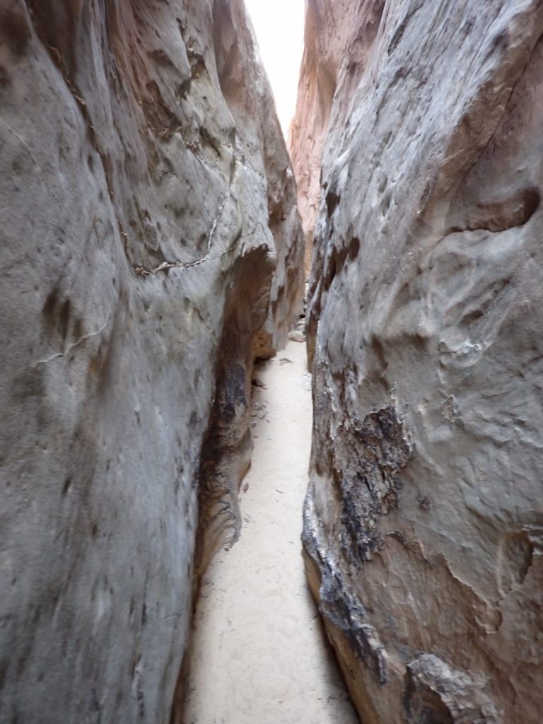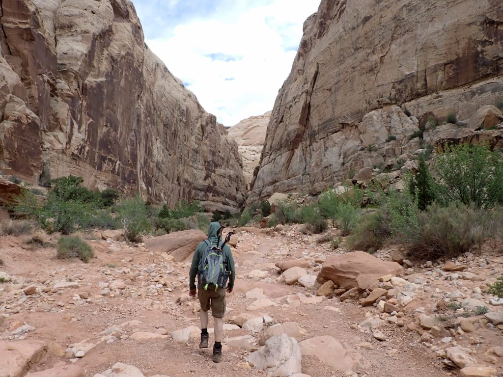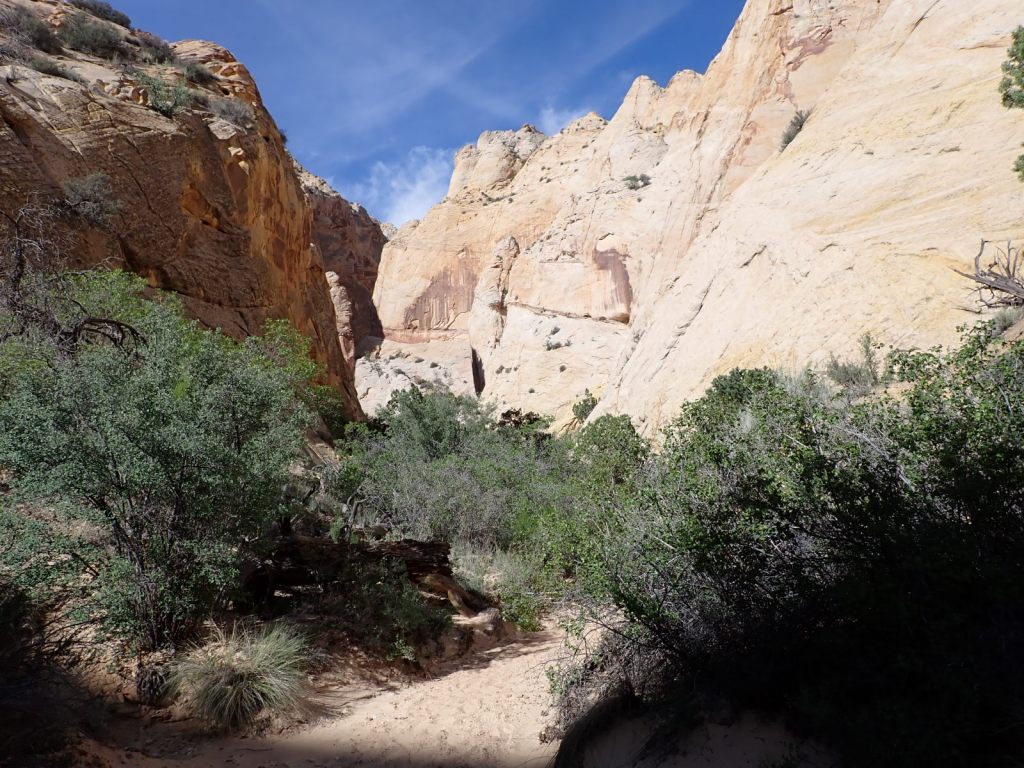 Afterward, we continued east on the Grand Wash Trail about another mile where it narrows as it cuts through the Waterpocket Fold. It’s said to be about 16′ wide and 600′ deep here. It’s an easy walk with little elevation change and very popular.