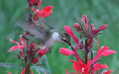 Female Ruby-throated Hummingbird feeding on Cardinal Flower