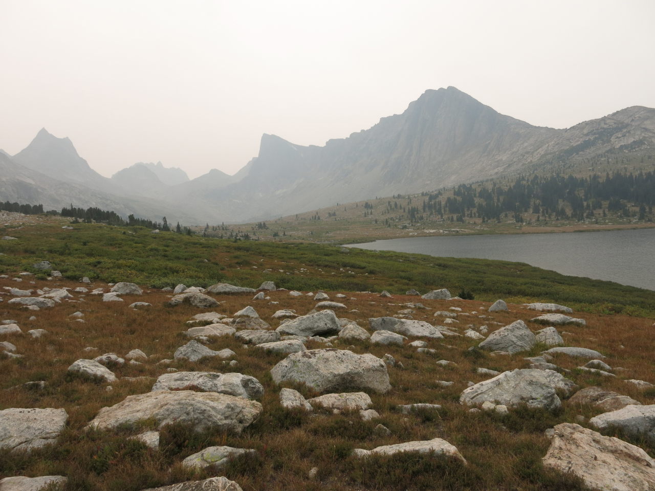 Approaching the inlet of Middle Fork Lake, with a hazy Pronghorn Peak just left of center and Dragon Head to its right.